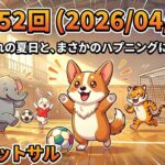 愛球フットサル第52回活動記録のブログアイキャッチ。朝の光が差し込む体育館で、コーギー、ゾウ、ウサギ、トラのキャラクターがフットサルを楽しむアニメ風イラスト。上部には「第52回(2026/04/11)季節外れの夏日と、まさかのハプニングに湧く体育館」とテキストが配置されている。